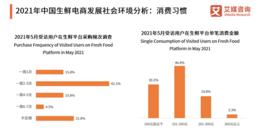 数据显示,42.1%的受访用户每周在生鲜平台采购2-3次,15.8%的受访用户一周4-5次;同时单笔消费金额水平主要在100元及以下和101-200元的受访用户占比分别为30.1%与46.8%,两者总和接近八成,疫情爆发一年后生鲜平台成功培养了用户的消费习惯。