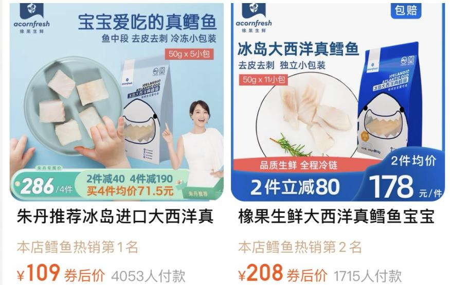橡果生鲜与鹿优鲜有相似之处,二者都发力鳕鱼、三文鱼等产品,这充分说明z时代宝妈对孩子营养成分的注重。