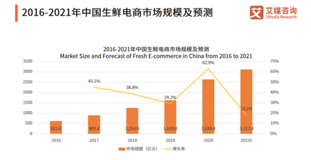 据艾媒咨询报告,2020年中国生鲜电商市场规模达到62.9%的高速增长,达到2638.4亿元,预计到2021年将升至3117.4亿元,同比增长18.2%。