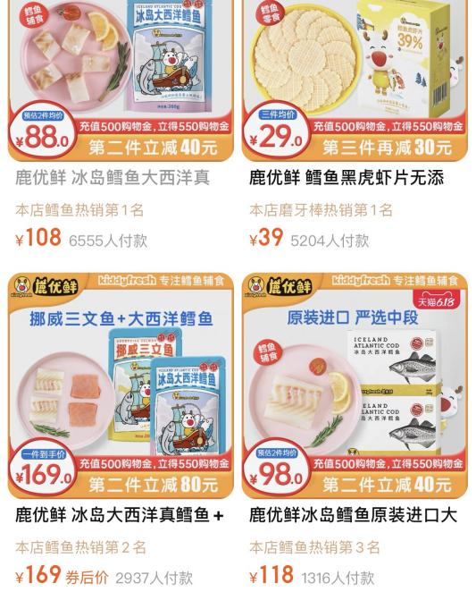 鹿优鲜的产品主要是海鲜类产品为主,尤其是专注于鳕鱼辅食。在某种程度上,鹿优鲜主要抓住婴幼儿需要吃高附加值、高品质的专业辅食产品的机遇,深耕自己的品牌。