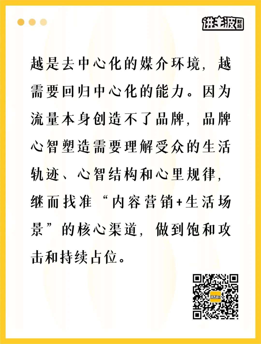 过往面面俱到的传播策略,让品牌陷入到离散的、泛滥的原始数据当中,传播路径也变得失控。而越是去中心化的媒介环境,越需要回归中心化的能力。因为流量本身创造不了品牌,品牌心智塑造需要理解受众的生活轨迹、心智结构和心智规律,继而找准“内容营销+生活场景”的核心渠道,做到饱和攻击和持续占位。
