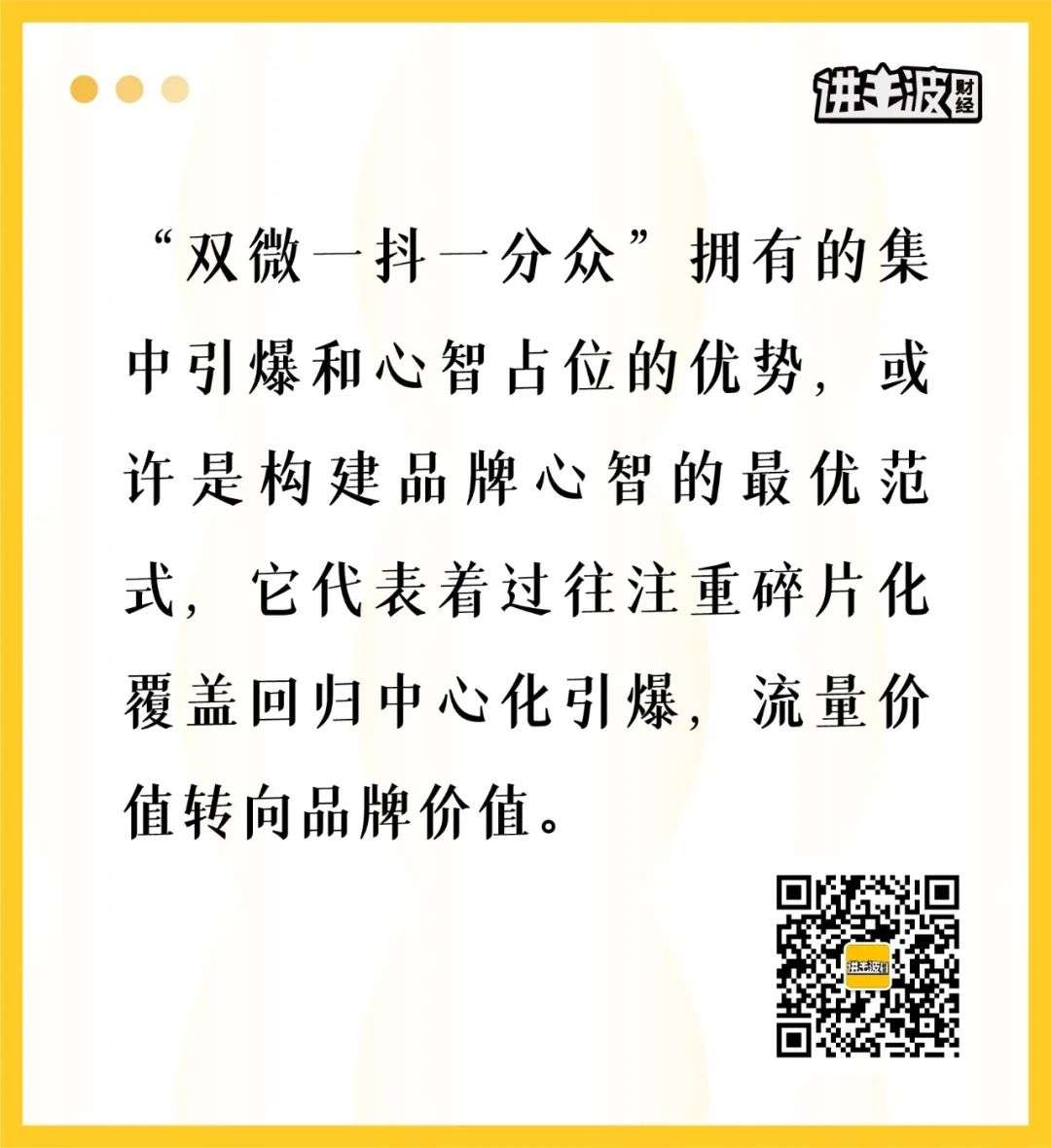 “双微一抖一分众”拥有的集中引爆和心智占位的优势,或许是构建品牌心智的最优范式,它代表着过往注重碎片化覆盖回归中心化引爆,流量价值转向品牌价值。