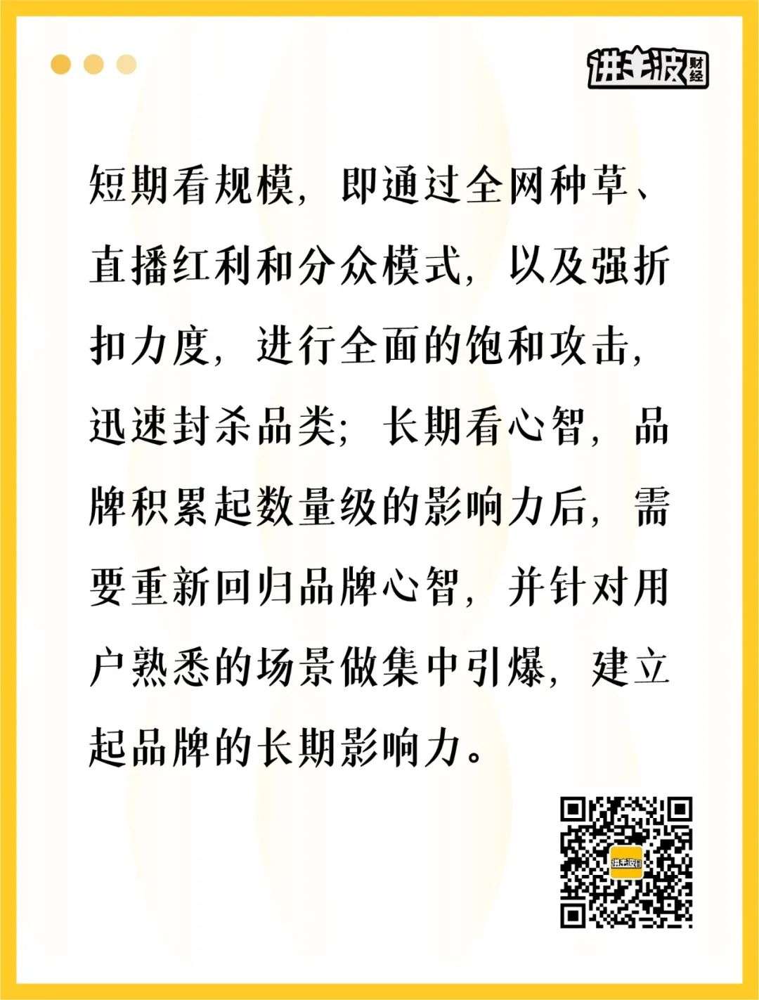 短期看规模,即通过全网种草、直播红利以及强折扣力度,迅速拉长规模优势,长期看心智,品牌积累起数量级的规模后,需要重新回归品牌心智,利用分众进行集中引爆,迅速封杀品类;实现从网红品牌到公众品牌的跃迁。