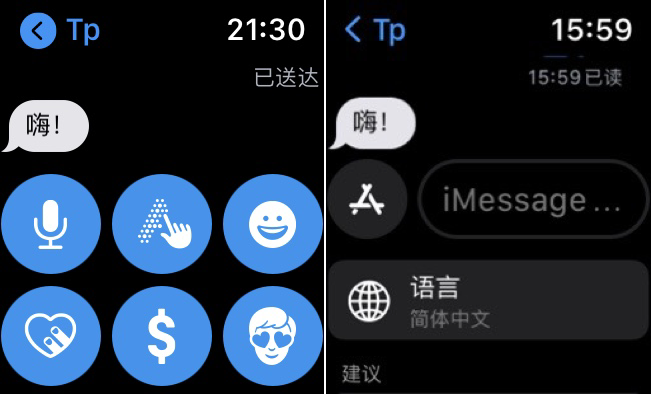 本次更新中,iMessage 迎来了非常大的改动,其中最直观的就是输入界面的变化。在 watchOS 8 中,iMessage 的输入界面进一步朝 iOS 靠拢,从原先的多个图标变为 App Store 图标 + 输入框。