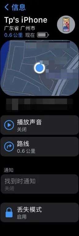 以「查找设备」为例,你可以直接在 Apple Watch 上看到自己其他设备的定位,并进行播放声音、启用丢失模式等操作,或者直接导航指设备所处位置。