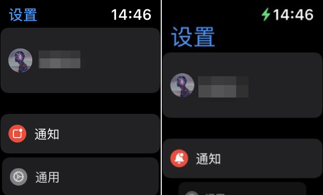 拿「设置」来说,在 watchOS 7 中,你不需要滚动屏幕就能轻松点到「通用」,但 watchOS 8 则需要向上滚动屏幕才能更好地点击到。与 iOS 一样,当你向上滚动屏幕后,标题也会缩小到上方,不影响正常使用。