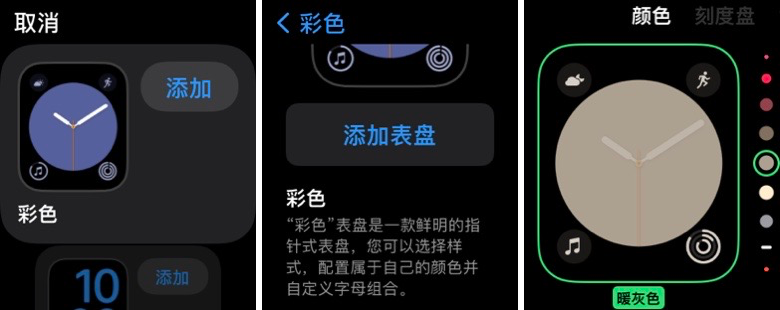 在新的表盘设置界面里,你会看到表盘以分类卡片的形式展示出来,点击左侧的表盘图标则可以查看它的详细介绍。如果你想添加某个表盘,只需要点击右侧的「添加」按钮即可直接进入编辑界面,完成编辑后按下数码表冠就能保存并退回表盘。