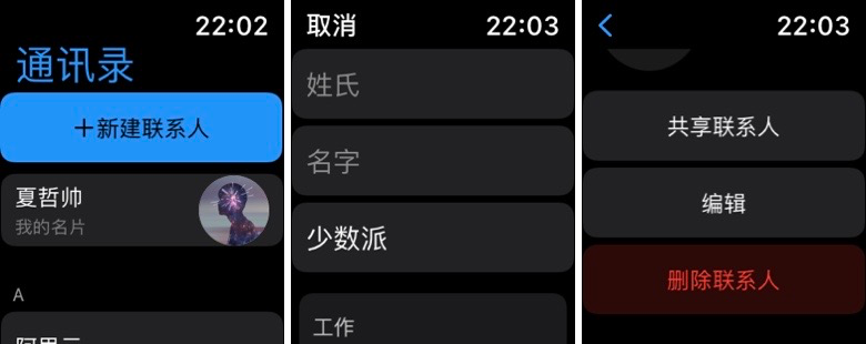 其实在 watchOS 7 的「电话」应用中就已经有「通讯录」的选项,但你只能进行打电话、发短信等操作,无法添加、删除或编辑联系人。到了 watchOS 8,Apple 终于为我们带来了「完整版」的通讯录应用。