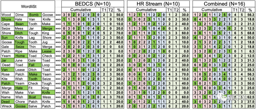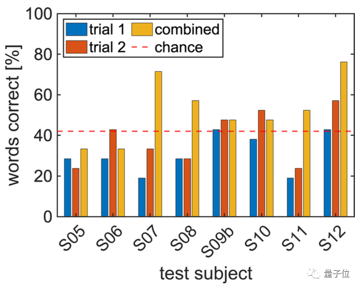 而在描述测试中,在告知测试对象所听到的声音信号来自于一个单词后,8位受试者中有6人可以在50%以上的测试中识别出相同单词的信号。