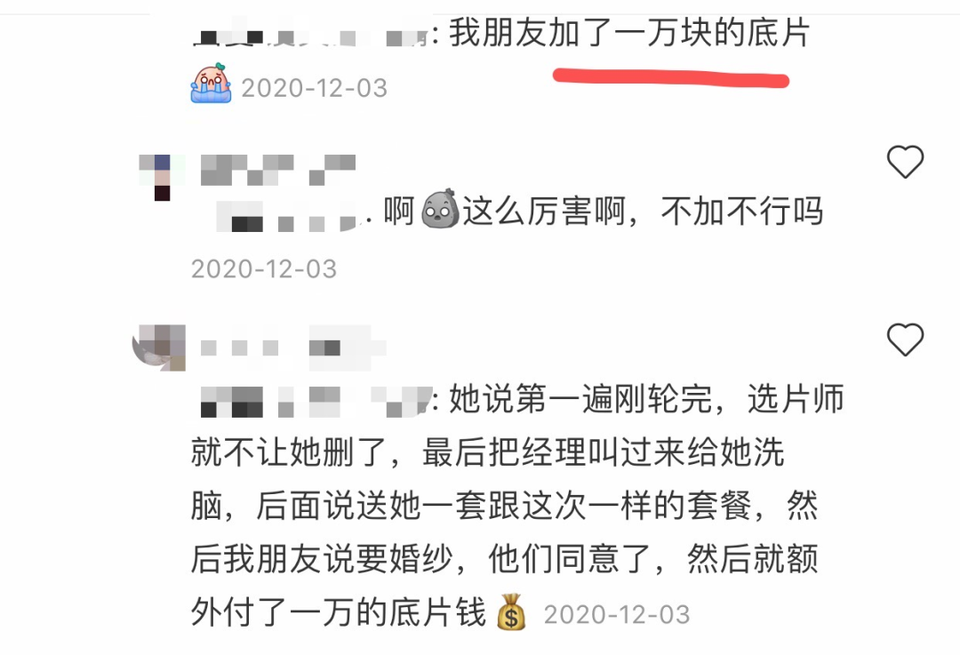 “买的3000元套餐,选片选出12888!”类似哭诉或许也是种别样的炫富。也有不少妹子被598优惠套餐钓上钩,据事后复盘: