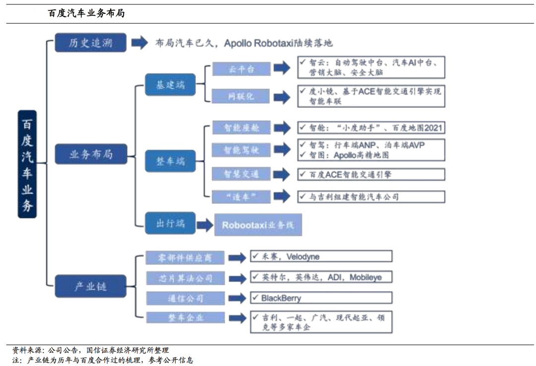 从产业链来看,百度与零部件供应商、芯片算法公司、整车企业展开合作。