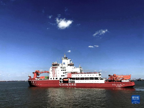 2020年11月10日,中国第37次南极科学考察队乘坐“雪龙2”号极地科考破冰船从上海起航,奔赴南极执行科学考察任务,这是“雪龙2”号极地科考破冰船驶离码头。新华社发(中国极地研究中心供图)