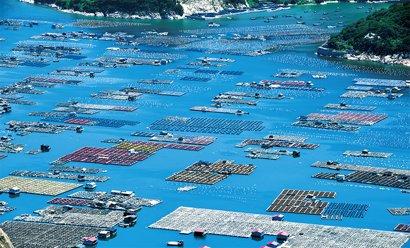 2022年8月15日,福建省连江县奇达村连成片的渔排宛如一座“海上牧场”(无人机照片)。奇达村是一个集齐了“山、海、岛、渔村”等元素的千年古村落,是天然的避风良港,适合养殖鲍鱼、海带等海产品。 中新社记者 王东明/摄