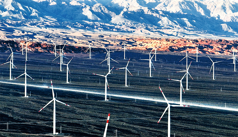 2022年5月21日,新疆生产建设兵团六师北塔山牧场刚刚建成的风力发电场风机林立,一派壮观的场面。 人民图片 王志清/摄