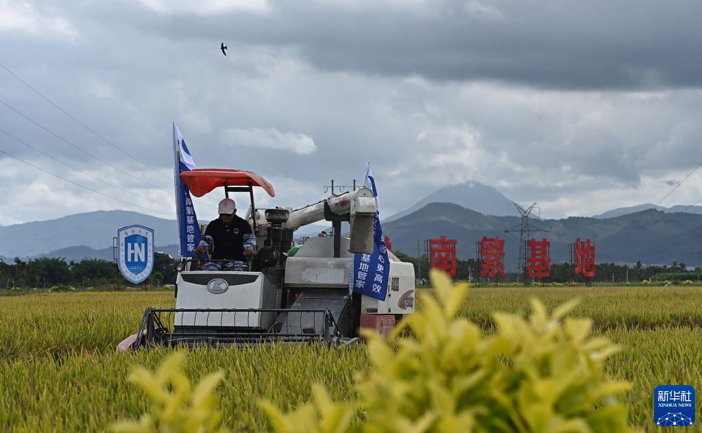 在三亚市崖州区(坝头)南繁公共试验基地试验示范点稻田,工作人员操作收割机收割水稻(2022年5月6日摄)。新华社记者 杨冠宇 摄