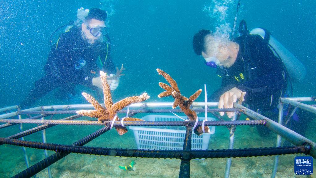 海南省海洋与渔业科学研究院的专家和分界洲岛旅游区工作人员在海南省陵水黎族自治县分界洲岛附近海域移植珊瑚(2022年6月7日摄)。新华社记者 张丽芸 摄