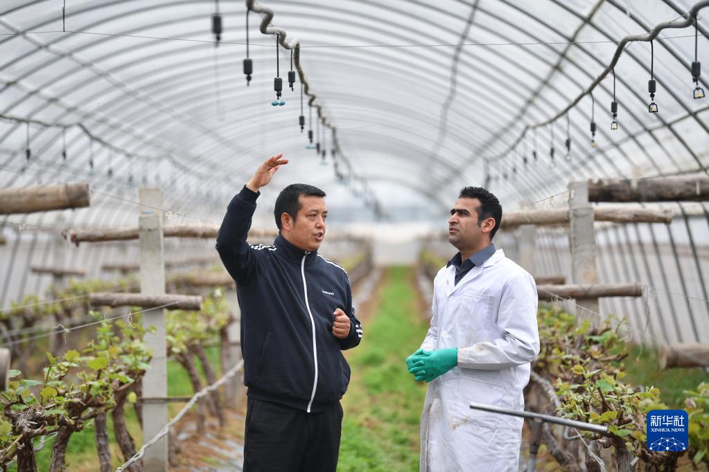 2021年3月17日,来自巴基斯坦的留学生(右)在陕西杨凌锦田农业专业合作社向当地职业农民了解水肥一体化灌溉设备。新华社记者 张博文 摄