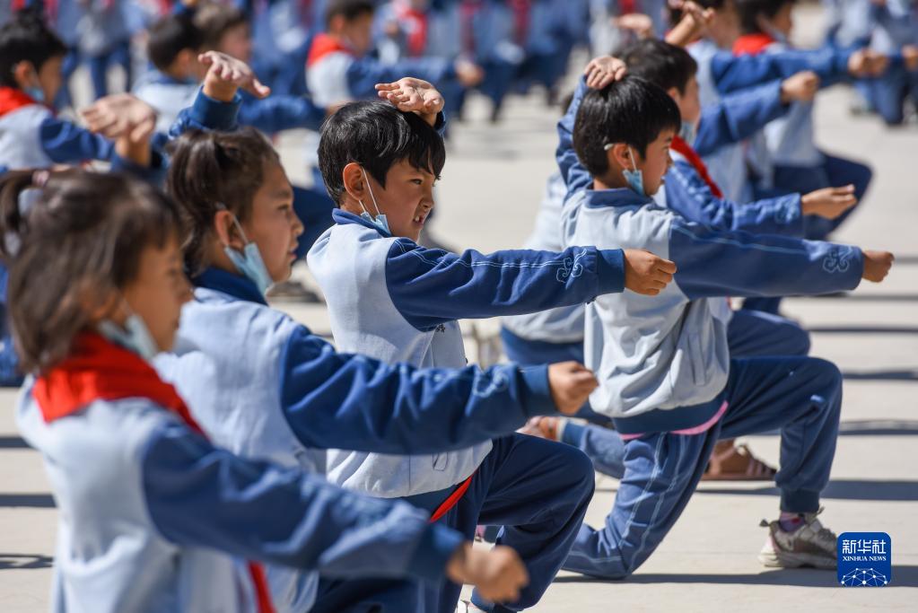 在新疆阿克苏地区乌什县依麻木镇国家通用语言小学,学生们在做课间操(2022年6月8日摄)。新华社记者 丁磊 摄