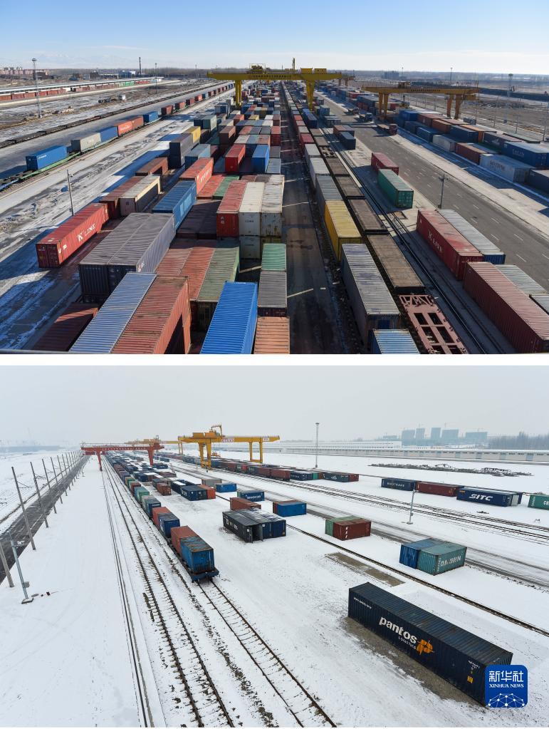 拼版照片:上图为2021年2月6日拍摄的新疆霍尔果斯铁路口岸换装场内的换装作业场景(新华社记者 丁磊 摄);下图为2013年12月25日拍摄的新疆霍尔果斯火车站换装场(新华社记者 江文耀 摄)。新华社发