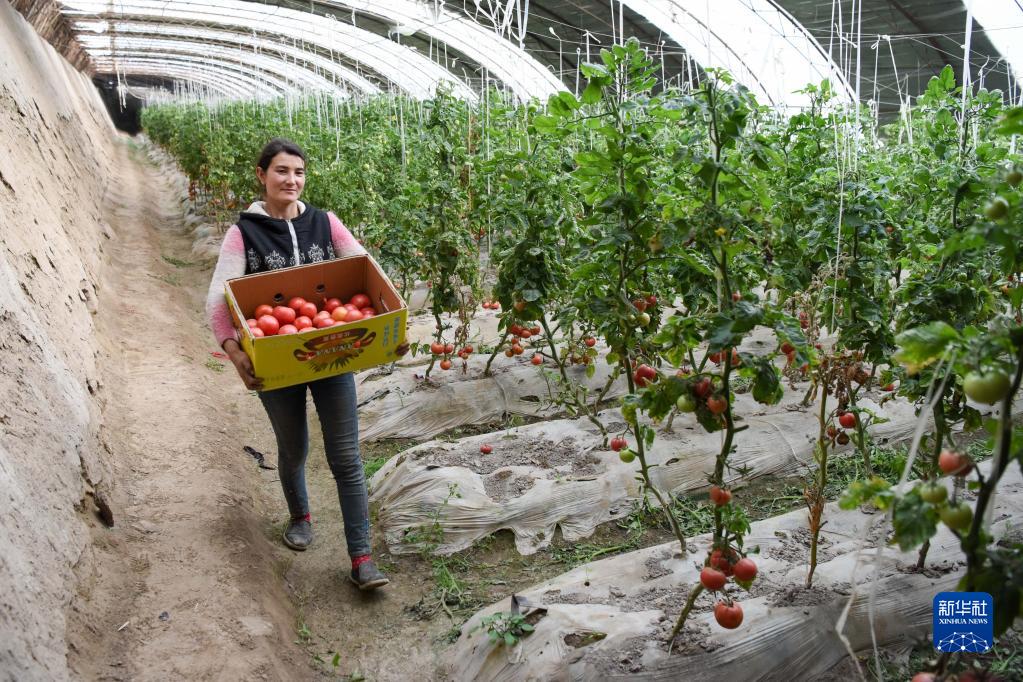 在新疆莎车县伊什库力乡设施农业基地,种植户搬运刚采摘的西红柿(2020年3月18日摄)。该设施农业基地是在上海援疆莎车分指挥部协调推动下建立的。新华社记者 丁磊 摄