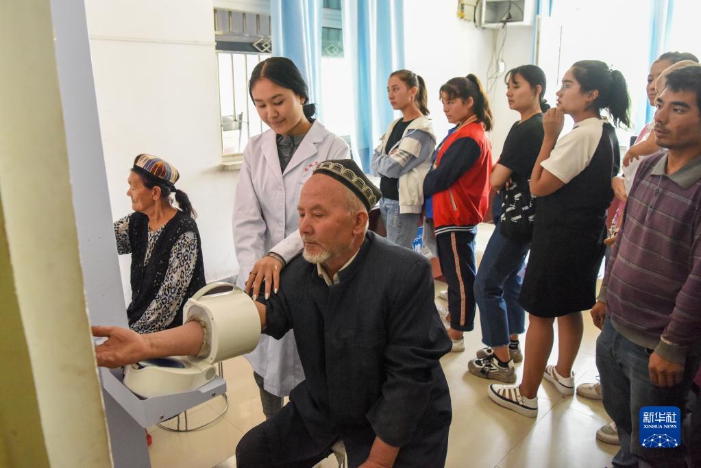 在新疆和田市伊里其乡中心卫生院,居民接受免费健康体检(2019年8月23日摄)。新华社记者 丁磊 摄
