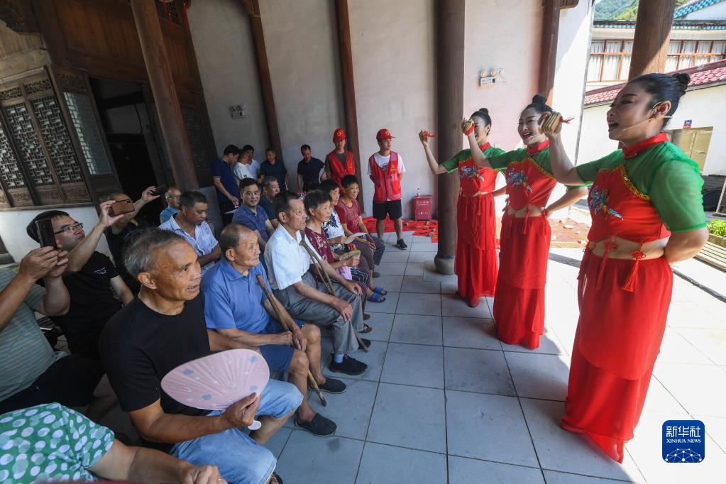 浙江省杭州市临安区高虹镇廉政文艺宣传队在石门村表演快板小段《清廉高虹》(2021年9月1日摄)。新华社记者 徐昱 摄
