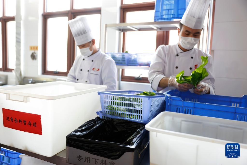 在某中央国家机关食堂,厨师将菜根等边角余料放入暂存箱(2020年10月26日摄)。新华社记者 刘彬 摄