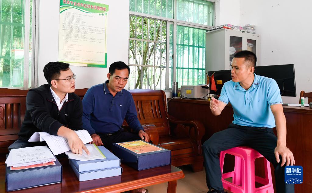 在海南省琼中黎族苗族自治县湾岭镇加章村委会,纪检监察干部(左一)在查阅乡村振兴及村级财务支出相关材料(2021年11月13日摄)。新华社记者 杨冠宇 摄
