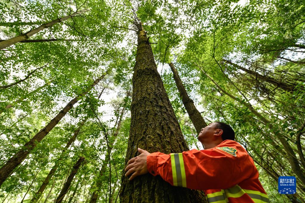 在贵州省贵阳市国家级森林公园,村级林长郭健用手量一棵树的直径(2022年7月13日摄)。 新华社记者 杨文斌 摄