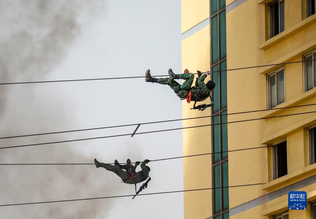 在模拟反恐演练中,武警猎鹰突击队特战队员利用铁索接近被“恐怖分子”占据的楼房(2019年4月4日摄)。新华社发(杨志毅 摄)