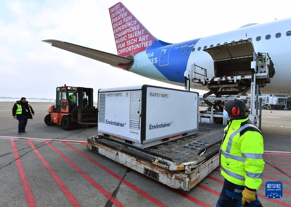 2021年1月16日,在塞尔维亚首都贝尔格莱德,机场工作人员卸载由中国国药集团生产的新冠疫苗。新华社发(普雷德拉格·米洛萨夫列维奇摄)