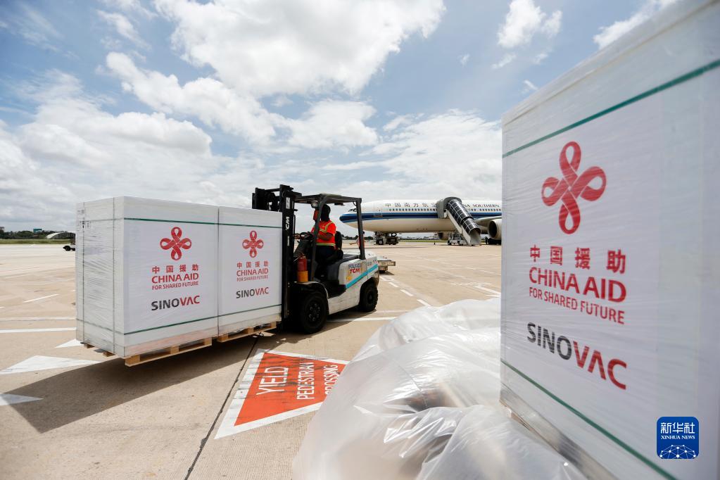 2021年10月14日,工作人员在柬埔寨金边国际机场运输中国政府援助柬埔寨的科兴新冠疫苗。新华社发(批隆摄)