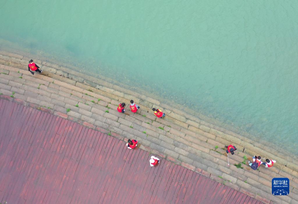青年志愿者在湖南省衡阳市湘江岸边捡拾垃圾(2021年3月21日摄)。新华社发(曹正平摄)