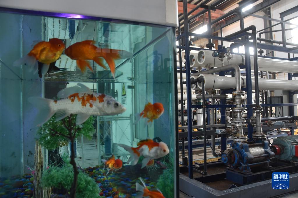 湖南省衡阳市水口山一家铅冶炼厂内放置了一个鱼缸,里面养了多条金鱼(2022年3月10日摄)。鱼缸里的水,正是经膜处理后的工业废水。新华社记者 白田田 摄