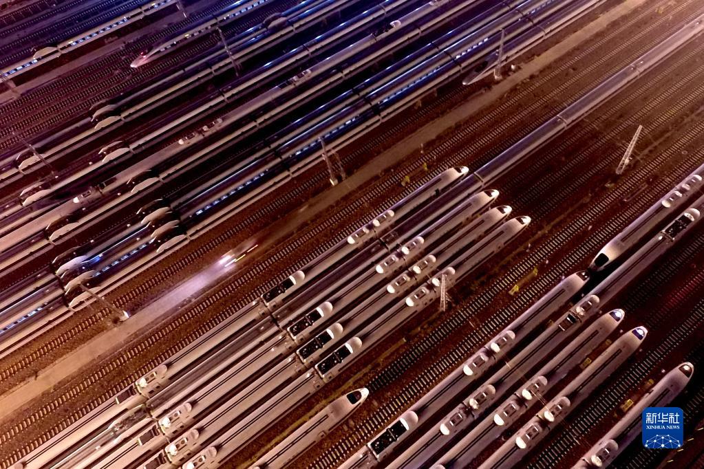 动车组列车停靠在郑州动车段停车场(2016年9月6日摄,无人机照片)。新华社记者 李安 摄