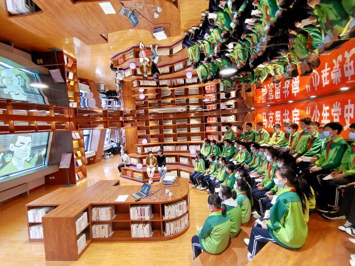 少年红色主题思政课堂常办常新。推出“少年党史故事汇”宣讲活动,成为少年红色主题思政课的进一步延续和深入。马克思书房的馆员们大量阅读馆藏文献,深入挖掘、充分学习研究,从党史历程中重新编排创作,从细微处着手,把一个个感人至深的党史小故事和令人尊敬的伟大人物讲给孩子们听。开展“四个一”的青少年红色教育活动——“讲一段红色故事、观赏一部红色动画片、写一篇感言、赠一张马克思书房红色主题明信片”,用马克思书房馆员与青少年交流互动的方式使思政课堂“活”起来,以寓教于乐的方式让孩子们“听党史、感党恩”,以润物无声的方式在孩子们心中种下一颗红色的种子。截至2021年底,共接待学生83批4000余人次。同时,“少年党史故事汇”还走出马克思书房走进校园,半年的时间,马克思书房的馆员们共赴6所中小学校为600余名学生授课,受到广大师生的热烈欢迎和广泛好评。
