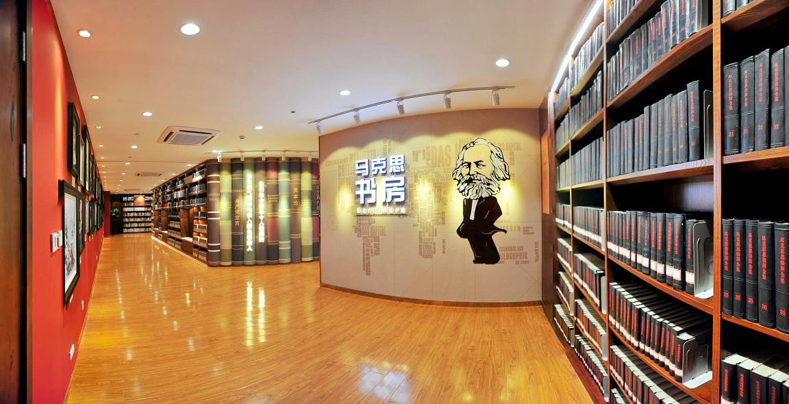 马克思书房集文献整合、空间叠加、功能融合于一体,收藏马克思主义相关文献22000余册,划分为四个区域。展览展示区陈列第一版《马克思恩格斯全集》,共50卷53册。马克思生平展览用丰富的图片和翔实的文字勾勒出一个不畏艰险、皓首穷经、矢志不渝追求真理的马克思形象。在休闲阅览区,陈列了时间跨度从新中国成立初期到二十世纪八十年代的珍贵馆藏文献。交流研讨区中,马克思书房馆员们将部分红色文献进行分类整理,设置专架,包括伟人传记、扫码阅读、青少年读本、新书推荐等,分类清晰,一目了然,读者可迅速定位,找到所需书籍。特设“习近平新时代中国特色社会主义思想文献专区”和“习近平总书记读过的书”专架,旨在让广大读者深入学习马克思主义中国化的最新成果,推动习近平新时代中国特色社会主义思想大众化。颇具特色的“马克思大脑”区域,集读书阅览、宣讲活动、交流研讨于一体,彰显时代感、时尚感,半弧形书架犹如“敞开的心扉”,悦纳四面八方慕名而来的读者。此处阶梯造型设计匠心独具,读者在其中可拾阶而坐、静心阅读,各机关、企事业单位、高校以及中小学校也可组织团队开展红色主题学习教育活动,加强党性修养,涵养精神世界。